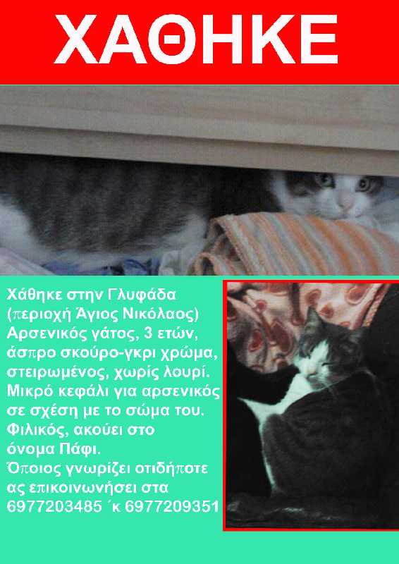 Χάθηκε ο Πάφι (Puffy) στη Γλυφάδα (περιοχή Αγ. Νικολάου), αρσενικός